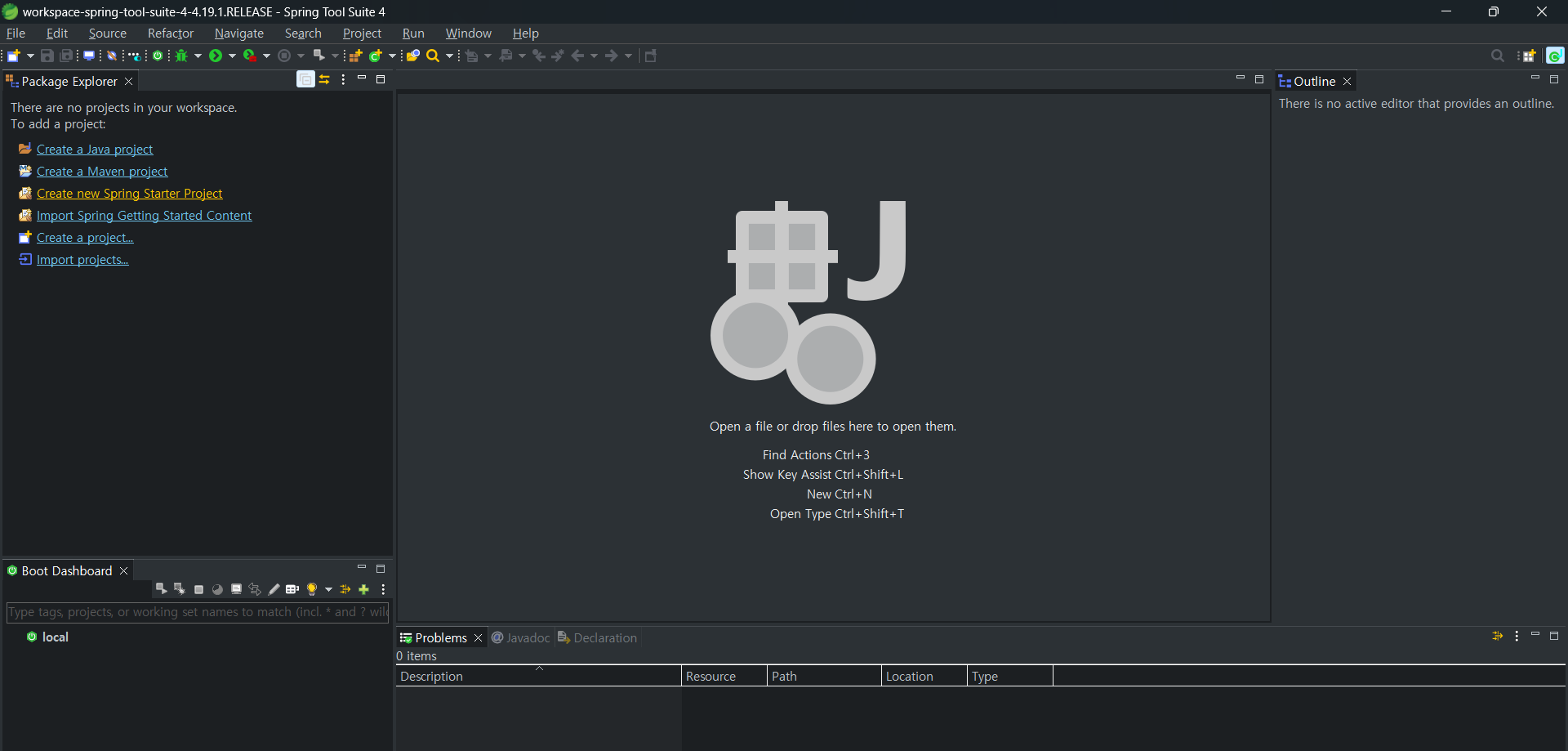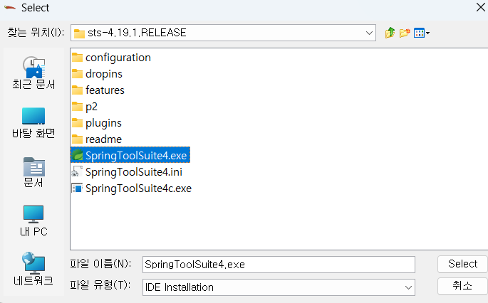 생성된 폴더 안의 SpringToolSuite4.exe 프로그램을 실행하면 STS가 실행된다.