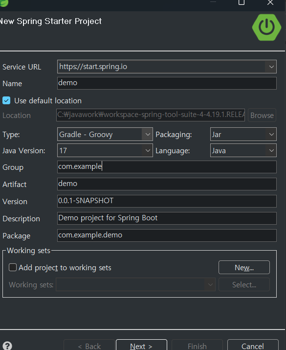 스프링 부트 버전 및 의존성 라이브러리들 설정 - Finish