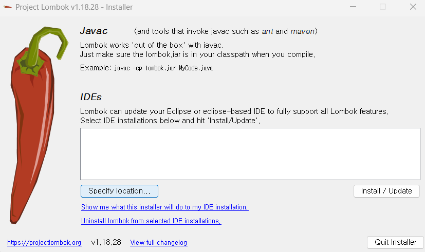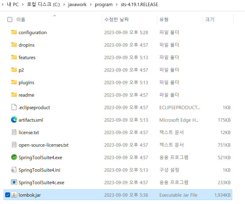 sts-4.19.1.RELEASE (STS프로그램 설치된 디렉토리)에 lombok.jar 파일 이동