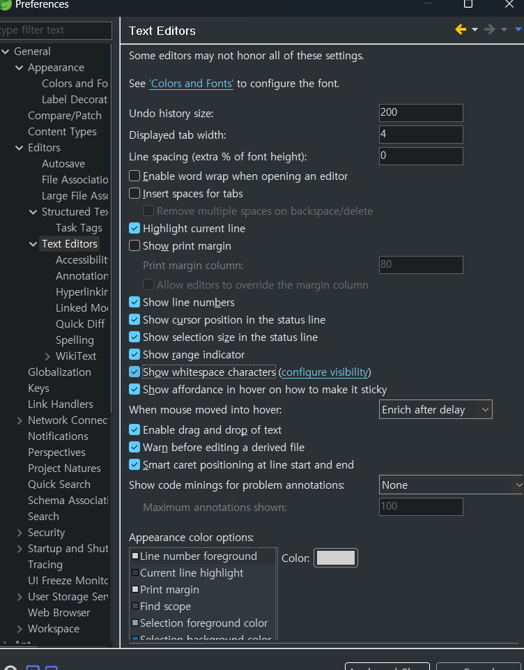 - General - Editors - Text Editors - Show whitespace characters (공백, Tabs 표시해주는 설정)