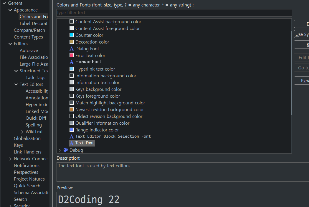 - General - Appearance - Colors and Fonts - Basic - Text Font - font 설정