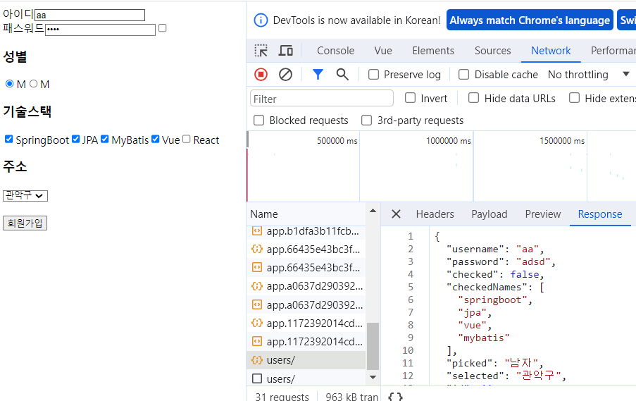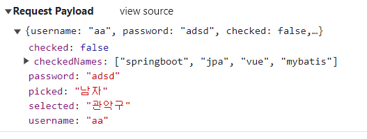 payload를 클릭하면 요청할 때 보낸 data를 확인할 수 있다.