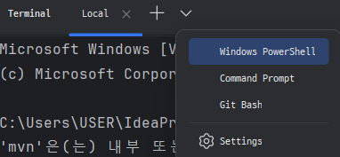 IntelliJ의 터미널을 이용해 프로젝트의 작업을 수행할 수도 있다.